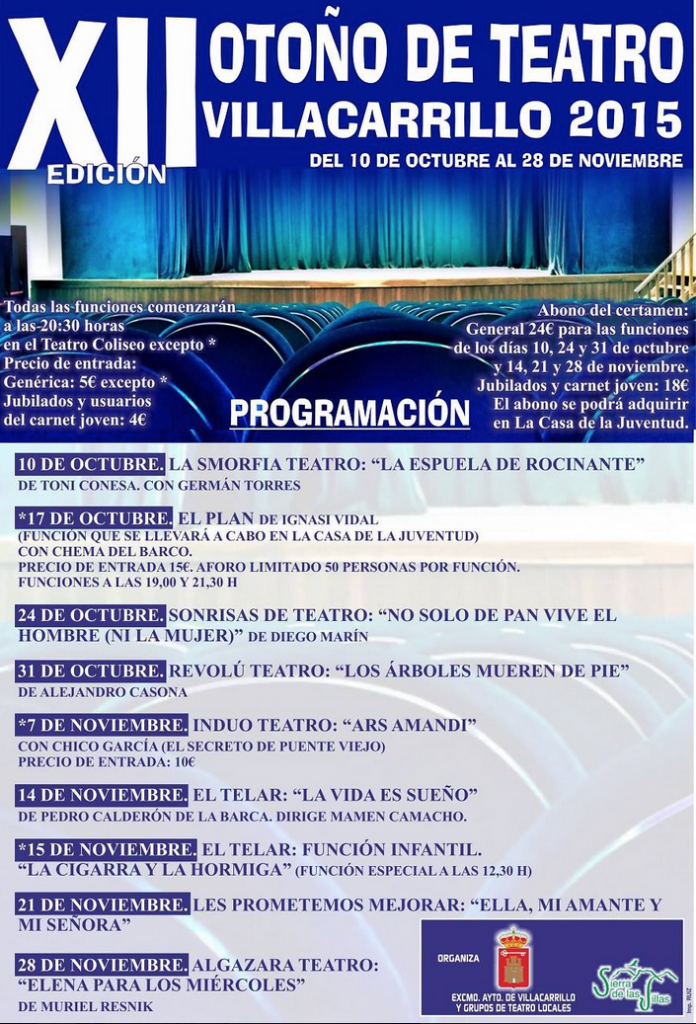 Ya tenemos todo preparado para vivir un otoño cargado de buen teatro, del mejor diría yo. Se acaba de presentar la XII Edición del Otoño de Teatro y te contamos lo que va a dar de sí la programación. Este año con importantes novedades y una apuesta clara por seguir innovando y creciendo para poder ofrecer al espectador la posibilidad de disfrutar de obras de factura muy diferente y formatos hasta ahora nunca vistos en Villacarrillo. Del mismo modo la idea es facilitar que los aficionados al teatro puedan acudir al mayor número posible de propuestas a un precio reducido. Es por esto que ponemos a la venta una serie de abonos que se podrán adquirir en la Casa de la Juventud (horario de oficina). Los precios son los que detallamos a continuación y siguen favoreciendo a los colectivos de personas mayores y jóvenes.