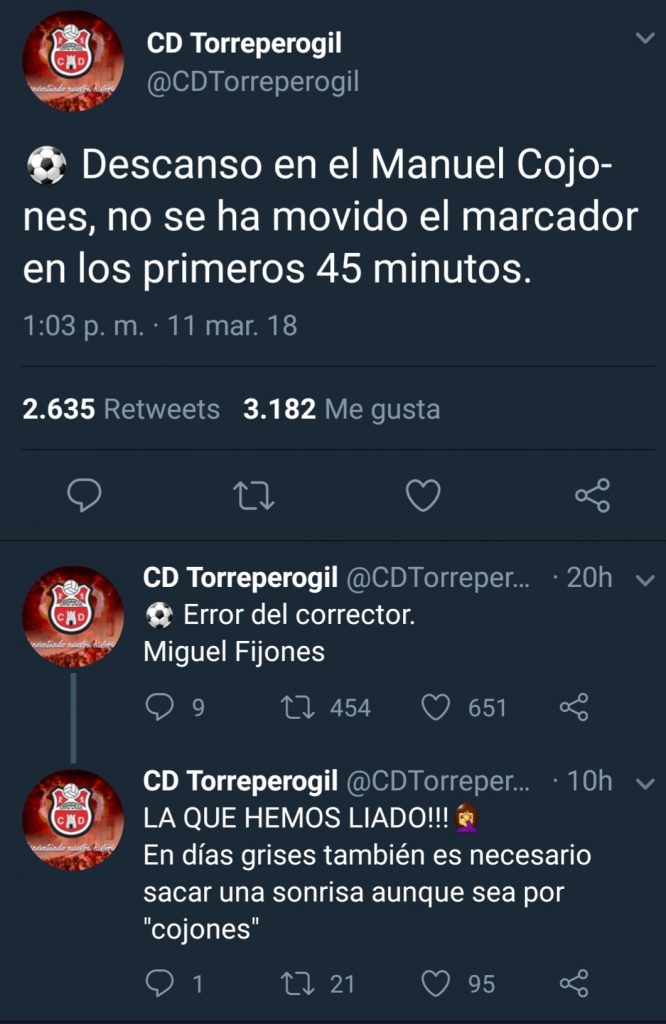 La tarde de ayer domingo fue de sensaciones encontradas para los aficionados del CD Torreperogil, que gracias a un “pequeño error” ortográfico en sus redes sociales, le ha permitido recibir miles de “me gustas” en Twitter.