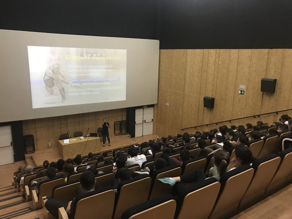 Mónica Rueda repasó ante los estudiantes cada uno de los hitos de su carrera. De esta forma, explicó como, desde muy pequeña, se había sentido atraída por el hockey. Sin embargo, en un principio, se encontró con la oposición familiar, pero sus fuerzas para luchar por su sueño no se apagaron. Explicó cómo se apuntó en el equipo de Alcalá la Real y cómo consiguió su primer palo de hockey con el dinero conseguido durante los fines de semana.