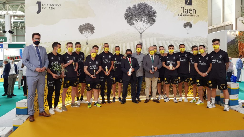 El Jaén Paraíso Interior Fútbol Sala ha visitado el estand de la Diputación Provincial en Expoliva. El presidente de la Administración provincial, Francisco Reyes, ha recibido a la plantilla del equipo que ha conocido los AOVE Jaén Selección. El diputado de Promoción y Turismo, Francisco Javier Lozano, presidente del Jaén Paraíso Interior, Germán Aguayo, y el humorista Santi Rodríguez, también han posado con los mejores aceites de oliva virgen extra de la pasada cosecha.