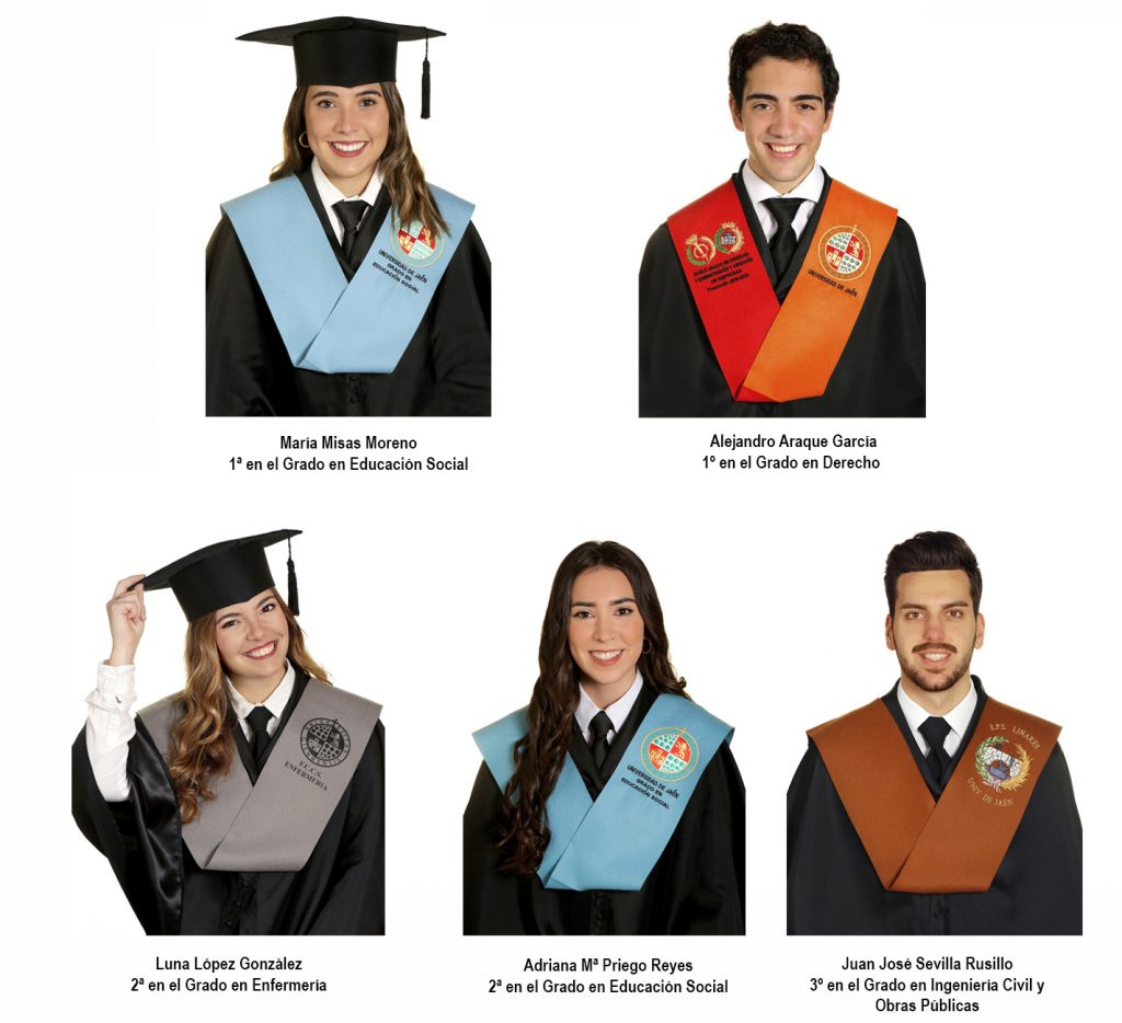 De estos 15 estudiantes, cinco se sitúan entre los tres primeros de cada Grado. Se trata de: Alejandro Araque García, primer clasificado en Derecho; María Misas Moreno, primera clasificada en Educación Social; Adriana María Priego Reyes, segunda clasificada en Educación Social; Luna López González, segunda clasificada en Enfermería, y Juan José Sevilla Rusillo, tercer clasificado en Ingeniería Civil y Obras Públicas.