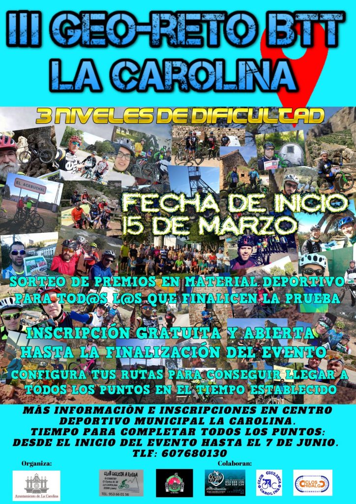 Los amantes de la bicicleta de montaña tienen una cita en La Carolina. El próximo 15 de marzo comienza la tercera edición del Geo-Reto BTT, una prueba que conjuga deporte con naturaleza, historia y cultura y fomento del turismo. La propuesta desafía al participante a que, en un plazo de tres meses, se llegue a los puntos establecidos en cada categoría y se haga una fotografía en ellos.