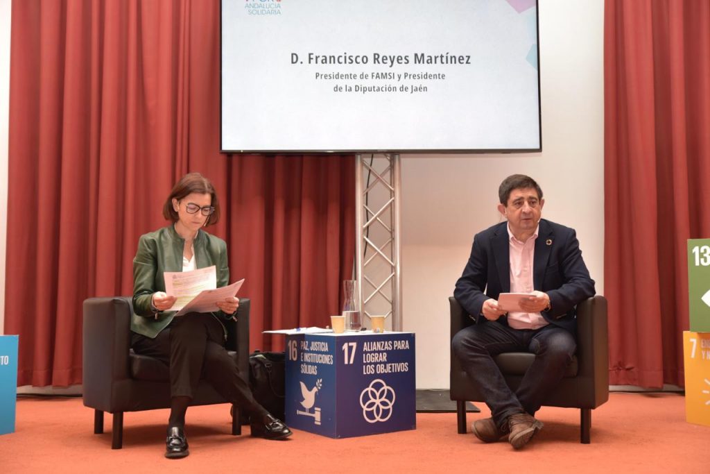 El presidente de la Diputación de Jaén y del Fondo Andaluz de Municipios para la Solidaridad Internacional (FAMSI), Paco Reyes, ha intervenido este miércoles en la charla inaugural del V Foro Andalucía Solidaria, que ha corrido a cargo de la secretaria de Estado de Cooperación Internacional al Desarrollo y presidenta de la Agencia Española de Cooperación Internacional al Desarrollo (AECID), Eva Granados, que ha disertado sobre la nueva Ley Española de Cooperación para el Desarrollo Sostenible y la Solidaridad Global. Reyes ha puesto énfasis en la importancia de la celebración de este foro ya que “supone una magnífica oportunidad para establecer nuevos espacios de trabajo y nuevas alianzas en materia de cooperación dentro de nuestra propia comunidad autónoma”.