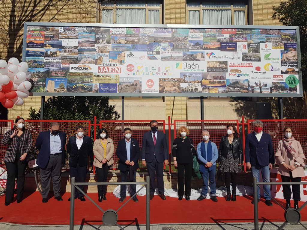 El presidente de la Diputación de Jaén, Francisco Reyes, acompañado por la vicepresidenta primera de la Administración provincial, Francisca Medina, ha participado hoy en la inauguración de un mural conmemorativo del 80º aniversario de Diario Jaén, una valla en la que tienen cabida todos los municipios jiennenses. En este acto, Reyes ha señalado que “no es fácil llegar a 80 años, no son muchas las personas, y menos las empresas, que alcanzan esta edad”, algo que a su juicio “es fruto del trabajo, de la constancia, la dedicación y de reinventarse constantemente”.