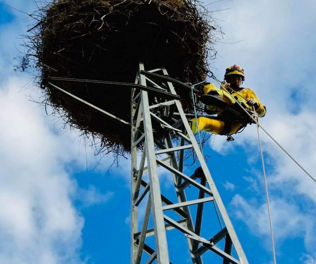 El trabajo del equipo de bomberos consistió en la escalada a la torre utilizando métodos de aseguramiento de los intervinientes, acceder al nido para poder coger los cigoñinos y bajarlos para su pesaje, medición y anillamiento.