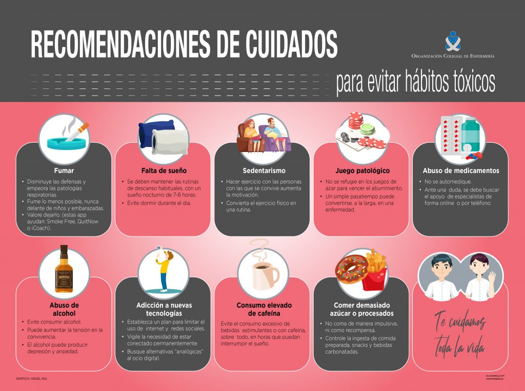 De forma muy visual, desde la Organización Colegial de Enfermería, se han desarrollado unas herramientas (infografía y video) sobre los principales hábitos tóxicos que la población puede tener riesgo de desarrollar en el confinamiento y establece recomendaciones como alternativa a ellos. Dejar de fumar, no abusar del alcohol, evitar la adicción a los juegos, el abuso de medicamentos, mantener una rutina de sueño de 7 a 8 horas, no ser dependientes de las tecnologías, convertir el ejercicio en una rutina junto a las personas con las que se convive, controlar la ingesta de bebidas estimulantes o mantener una dieta libre de azúcares y procesados son algunas de las recomendaciones para toda la población que se encuentra estos días encerrada en su casa para luchar contra el coronavirus.