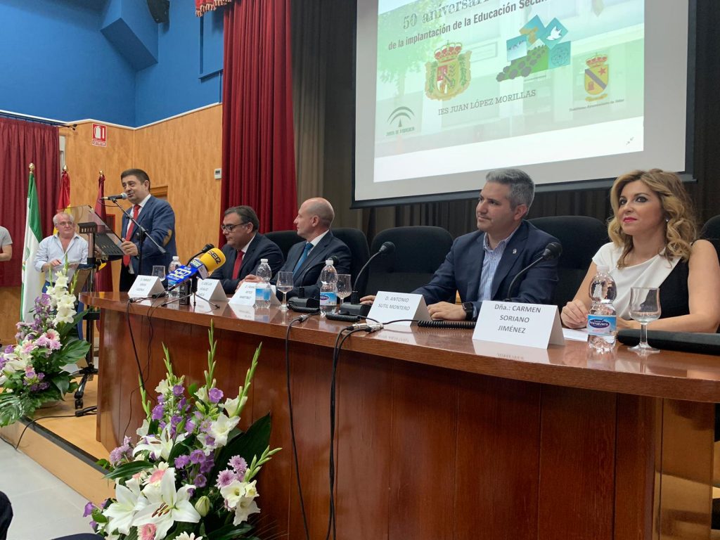 El presidente de la Diputación en funciones, Francisco Reyes, ha participado hoy en el acto conmemorativo del 50º aniversario de la implantación de Educación Secundaria en Jódar, celebración vinculada a la historia de los dos institutos existentes hasta la fecha en esta localidad: el Narciso Mesa y el Juan López Morillas, fusionados desde el curso 2010-2011 en un único centro. El acto ha contado con la participación del alcalde de Jódar en funciones, José Luis Hidalgo; el delegado territorial de Educación de la Junta, Antonio Sutil; y el director del IES Juan López Morillas, Enrique Yerves.