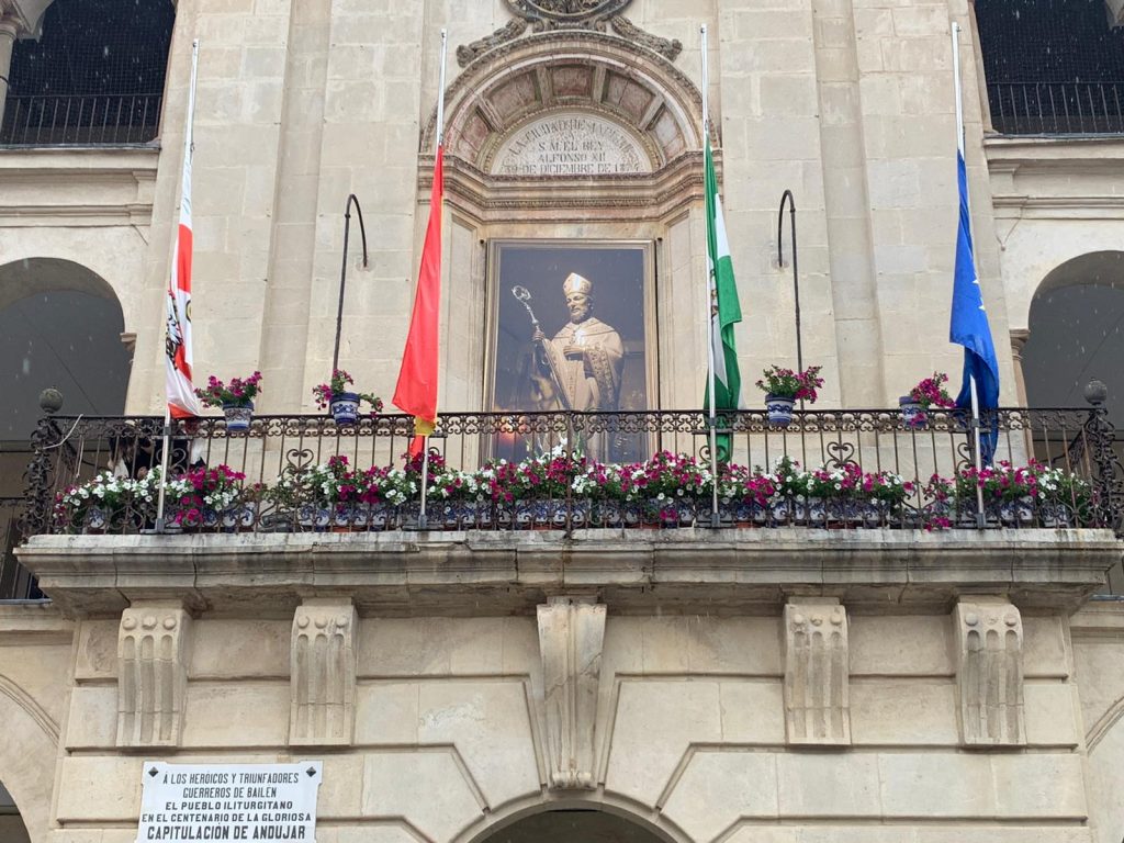 La imagen de San Eufrasio presidirá la fachada del Ayuntamiento de Andújar hasta el próximo domingo