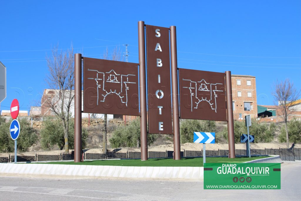Además, se ha intervenido en la intersección entre la JA-6106 y la antigua carretera de Úbeda, donde se ha instalado un elemento decorativo compuesto por tres partes: dos horizontales con el logo del Ayuntamiento de Sabiote, y una vertical donde se inscribe el nombre del munipicio. Este elemento está dotado con luces led en su interior, que pueden cambiar de color, y se sitúa sobre una zona dispuesta con jardín artificial.