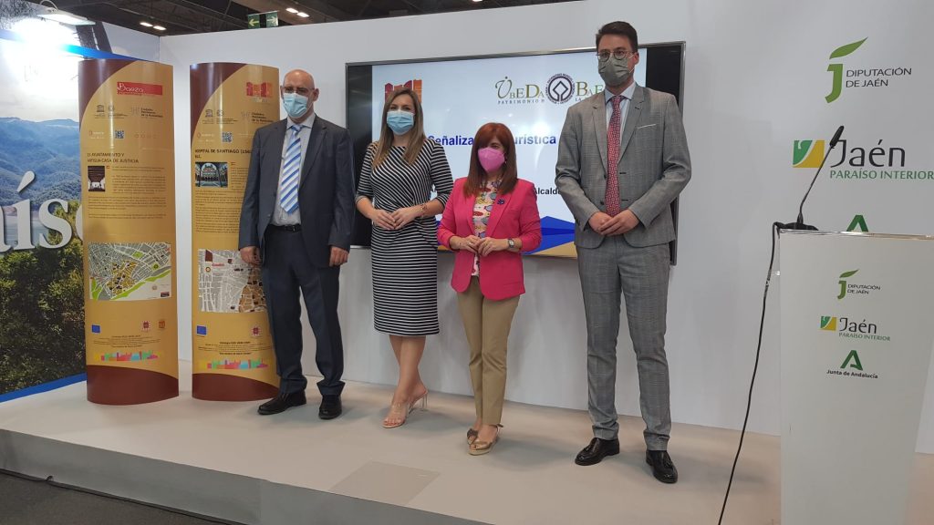 El diputado de Promoción y Turismo, Francisco Javier Lozano, y las alcaldesas de Úbeda y Baeza, Antonia Olivares y María Dolores Marín, respectivamente, han presentado en Madrid, en el marco de la feria de turismo Fitur 2021, la nueva señalización turística inteligente que ofrecerá información al visitante sobre los monumentos y enclaves de interés de las dos ciudades patrimonio de la humanidad.