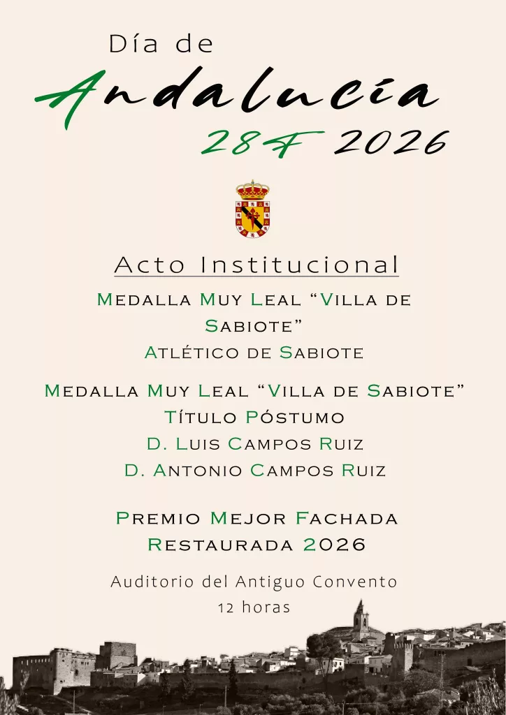 El Ayuntamiento de Sabiote celebrará mañana, sábado 28 de febrero de 2026, el Día de Andalucía con un acto institucional cargado de emoción y reconocimiento a entidades y personas destacadas de la localidad.