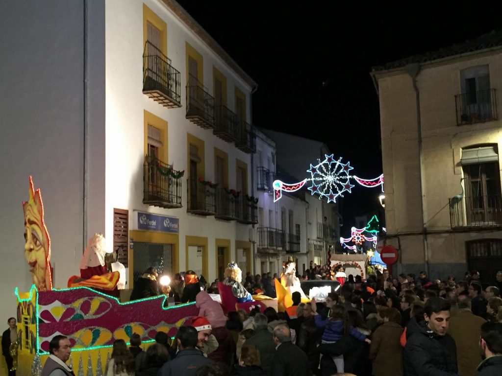 A las 19.00 horas de la tarde de ayer Melchor, Gaspar y Baltasar, junto con su comitiva real, partían desde la Puerta de la Villa y recorrían las distintas calles llenas de niños y mayores ilusionados con la visita. El desfile lo encabezaban distintos niños de Educación Primaria vestidos de ángeles, a éstos les seguían niños de la guardería municipal que representaron el Portal de Belén en una preciosa carroza.