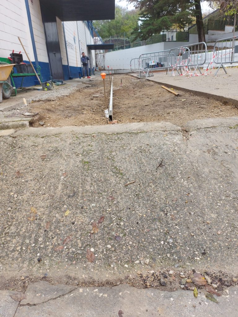 Para solucionar este problema, se ha realizado el picado completo de la zona afectada, la instalación de un nuevo mallazo, la corrección de pendientes y la reconducción del agua hacia distintos puntos de saneamiento y pozos, evitando así que el agua quede estancada y permitiendo un uso adecuado del patio y del acceso al pabellón.