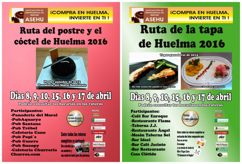 La Asociación de Empresarios y Empresarias de Huelma (ASEHU) y el Centro de Apoyo al Desarrollo Empresarial (CADE) han organizado, con la colaboración del Ayuntamiento de Huelma y varias instituciones, la edición 2016 de la ruta de la tapa y de la ruta del postre y el cóctel para los días 8, 9, 10, 15, 16 y 17 de abril.