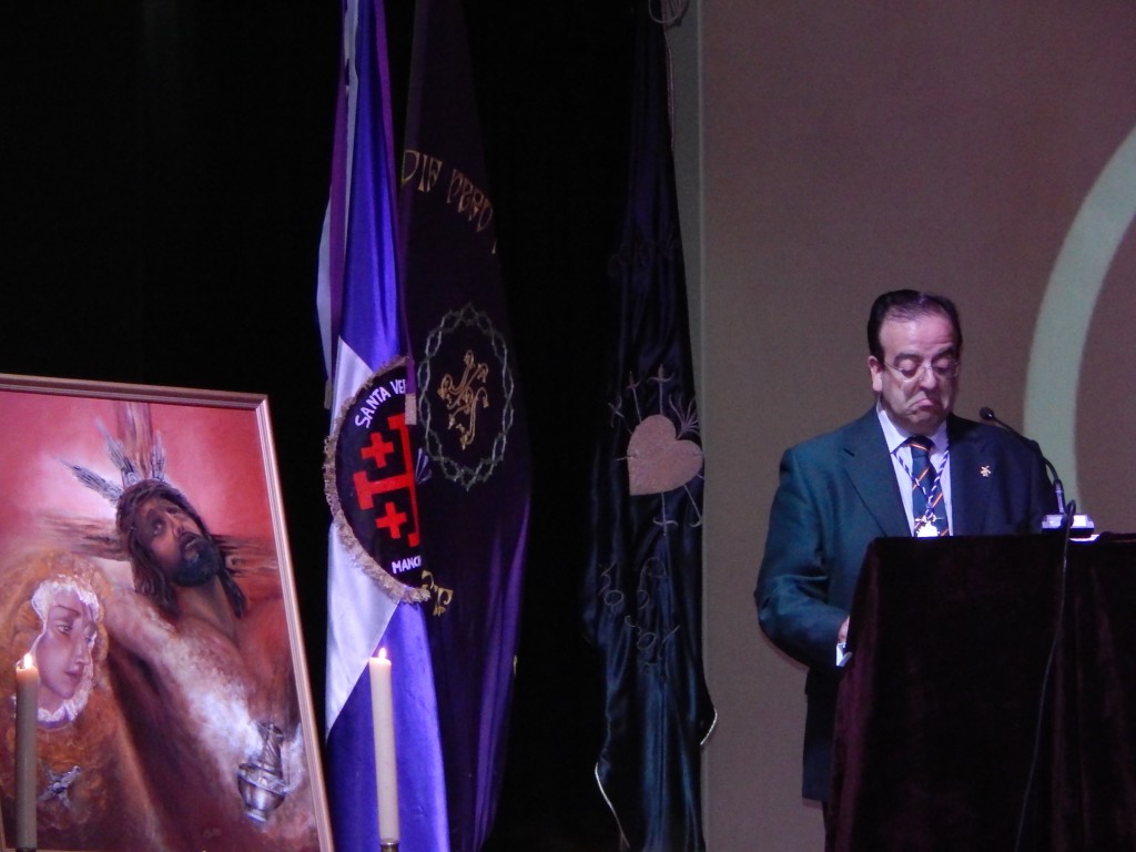 Tras el presidente, subía al escenario el pregonero de la semana santa 2014, Pedro Javier Quesada Labesa para presentar a su predecesor en este memorable cargo, dedicándole unas cariñosas palabras para Juan de Dios Gómez, que acto seguido tomo la palabra iniciando su pregón.