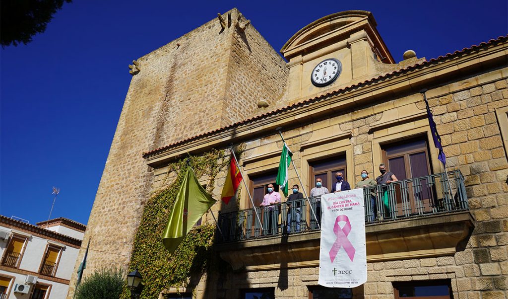 Una pancarta de la AECC con el lazo rosa, símbolo para concienciar sobre el cáncer de mama, luce de nuevo en el balcón del Salón de Plenos del Ayuntamiento de Mengíbar, y así estará hasta final de mes, con motivo de la celebración del Día Mundial Contra el Cáncer de Mama (19 de octubre).